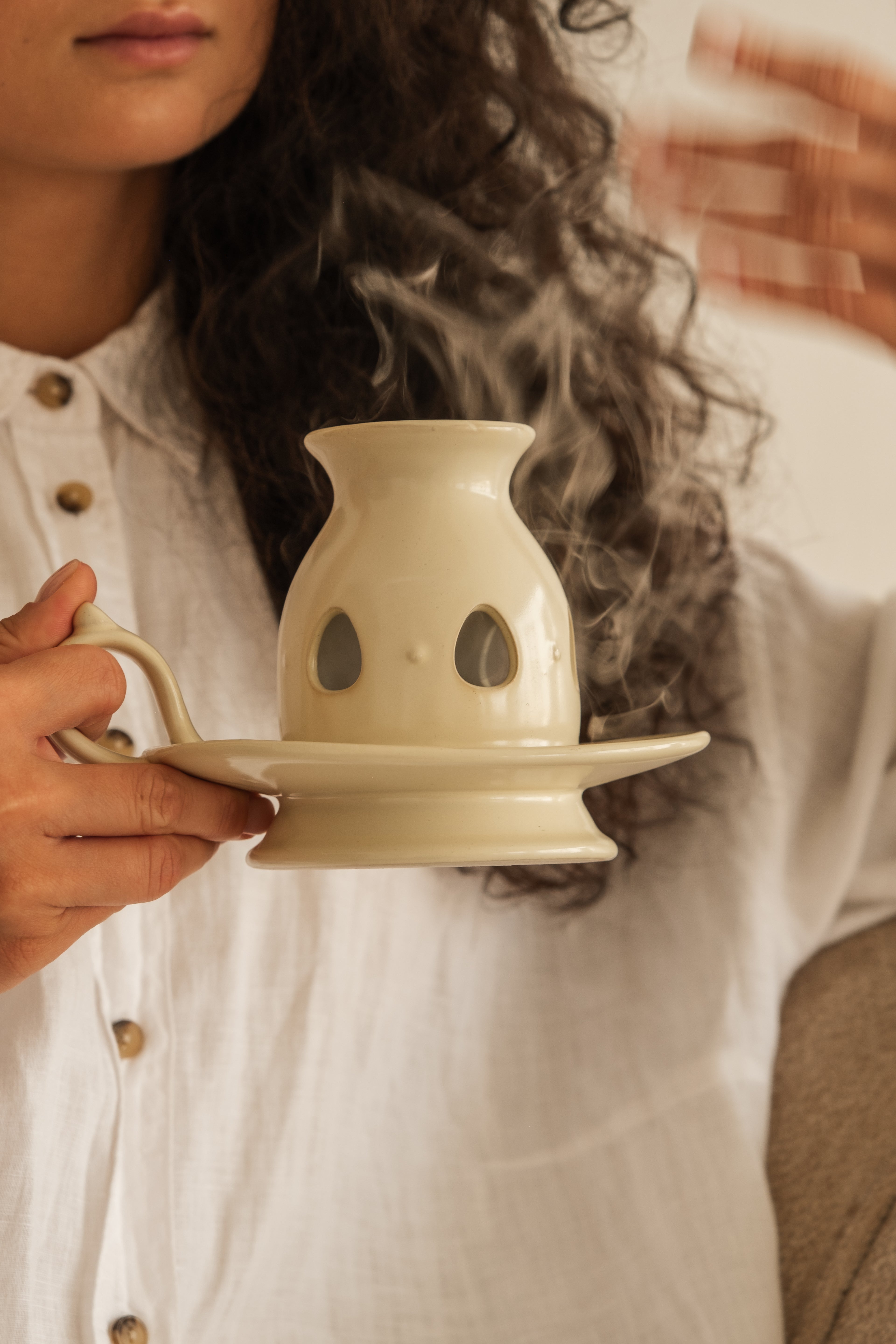 Handcrafted from stoneware clay to serve as a candleholder, incense burner, and oil diffuser ~ each form revealing a new ritual of scent, smoke & light.